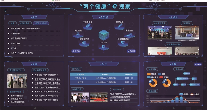 “企业的健康发展和企业家的健康成长是打造‘两个健康’e观察的初心和使命,因此在打造站点时,企业的健康成长是我们重点关注的内容。”龙湾区永兴街道人大工委主任陈祥介绍,“两个健康”e观察永兴站,一共建设了6个板块,分别是e企学、e企发展、e企成长、e企议、e企惠、e企督。