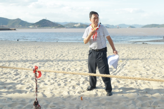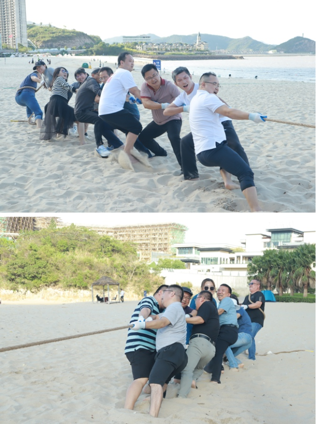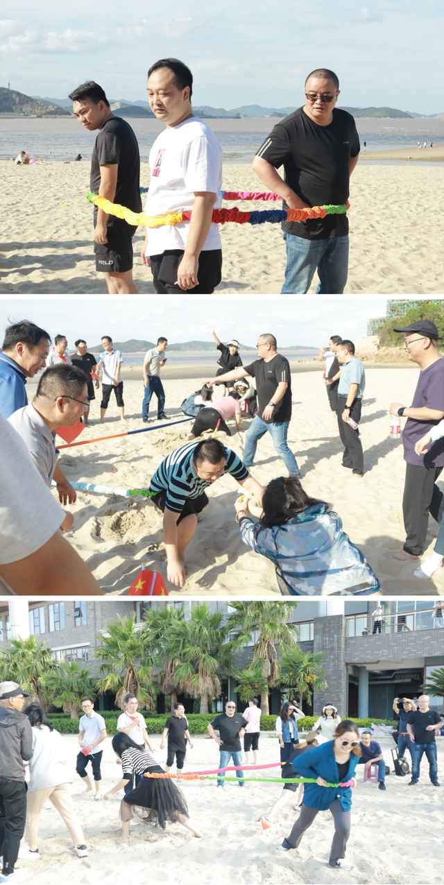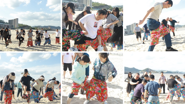 报告会结束后,与会人员乘坐大巴来到象山御海湾沙滩,进行沙滩趣味运动会,会员们热情高涨积极参与,每十人一组,分别组成财神、泰山、红鹰三支队伍。