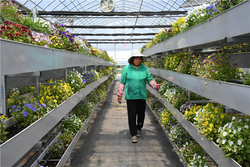在赤城县盛丰农业技术发展有限公司农业科技园区智能联栋温室里,工作人员在查看食用花的生长状况(2020年7月21日摄)。 新华社记者 任超 摄
