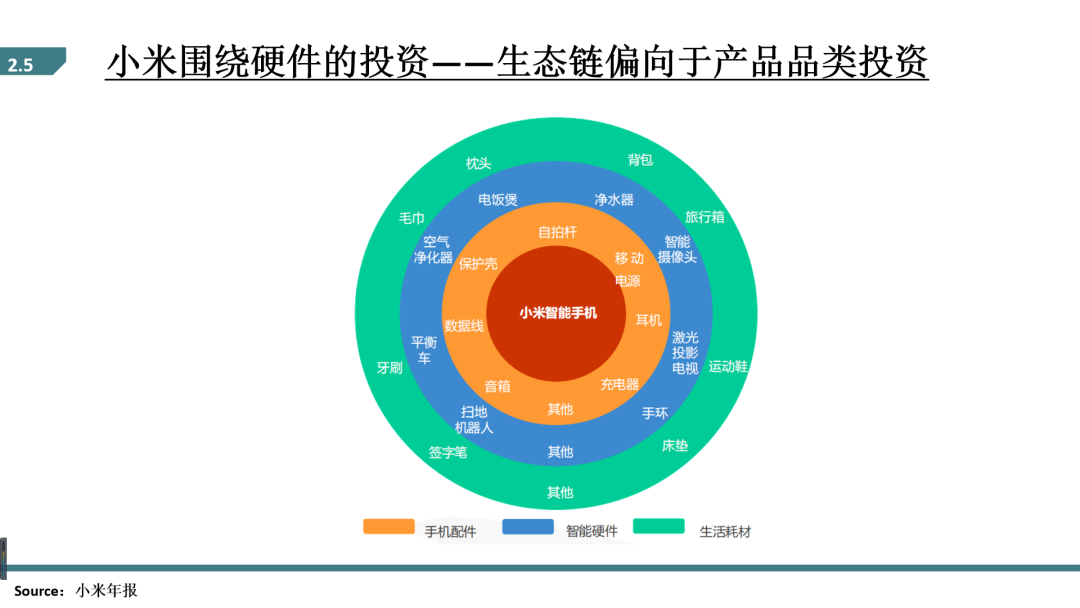 小米以智能手机为起点和基本盘,逐步构建了从核心向外围持续扩展, 从手机周边产品到智能硬件、生活耗材等的产品布局&扩展思路,并在此过程中坚持大众化产品、大众化功能的产品选型和设计思路。不断扩展的产品组合有助于实现更多用户需求的覆盖,提高用户产品黏性和整体业务生态壁垒。