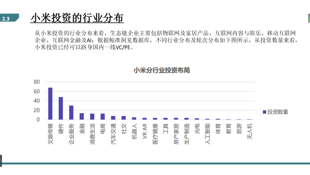 小米投资的轮次偏好是早期的天使轮和A轮;从行业偏好来看,小米围绕手机业务做了大量文与传媒投资,围绕IOT业务做了大量硬件投资。