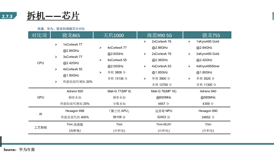 高通骁龙 865。骁龙 865 发布于 2019 年 12 月 4 日,是当前高通旗下最先进的 5G SoC 芯片,由台积电 7nm 工艺打造,目前约有 70 款终端搭载。从核心来看,CPU方面使用全新 Kryo 585 架构,采用 4 小核+3 中核+1 大核的 8 核心组合;GPU 方面,Adreno 650 性能相比前作提升 25%;