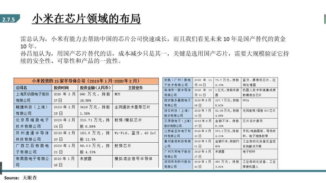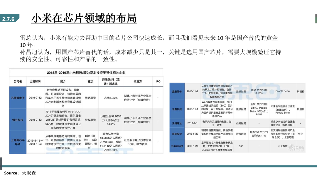 从2017年开始,小米投资方向有了明显的转变——投资上游芯片设计公司,即专注“产业链”投资。2017年,小米科技与湖北省长江经济带产业引导基金共同成立了专门投资芯片的产业基金公司——湖北小米长江产业基金合伙企业(有限合伙),简称“小米长江产业基金”。