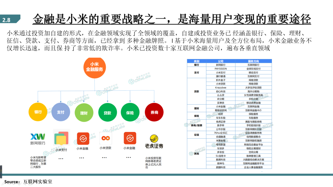 小米通过投资加自建的形式,在金融领域实现了全领域的覆盖,自建或投资业务已 经涵盖银行、保险、理财、征信、贷款、支付、券商等方面,已经拿到 多种金融牌照。