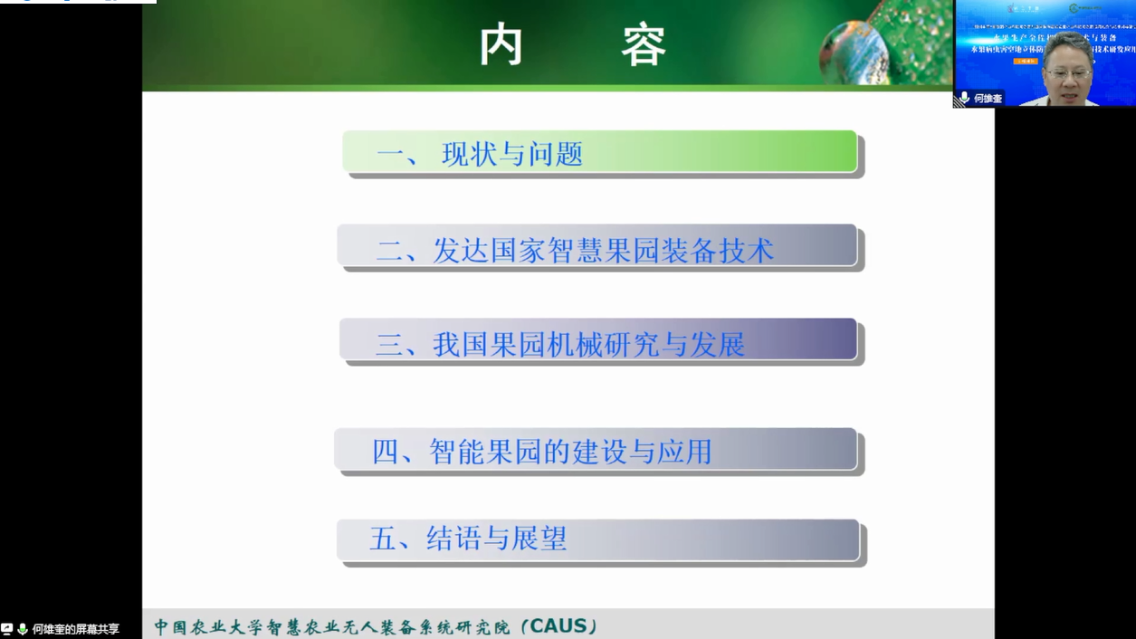 何雄奎教授作了题为《水果病虫害立体防控一体化装备与技术研发应用》的报告,从劳动成本、机械化率、传统与智慧果园、果园智能机械装备等方面分析了我国果园发展现状与存在的问题,介绍了发达国家智慧果园的管控技术与作业装备。何教授还介绍了我国果园智能装备的研发与应用,尤其详细讲解了中国农业大学自动对靶施药技术与无人喷雾机、仿形变量喷雾机、果园采摘技术、植保无人机与低空低量航空施药技术、迁飞性虫害信息获取技术与装备等研究。最后,何教授简要介绍了中国农业大学智慧果园实例,如北京平谷西营智慧果园、三亚研究院智慧果园、吉林延边智慧苹果梨园等。对实现少人化、智能化、无人化果园管理有重要参考价值,对研发既高效又实用、易于果农接受的果园智能装备有一定的指导作用。