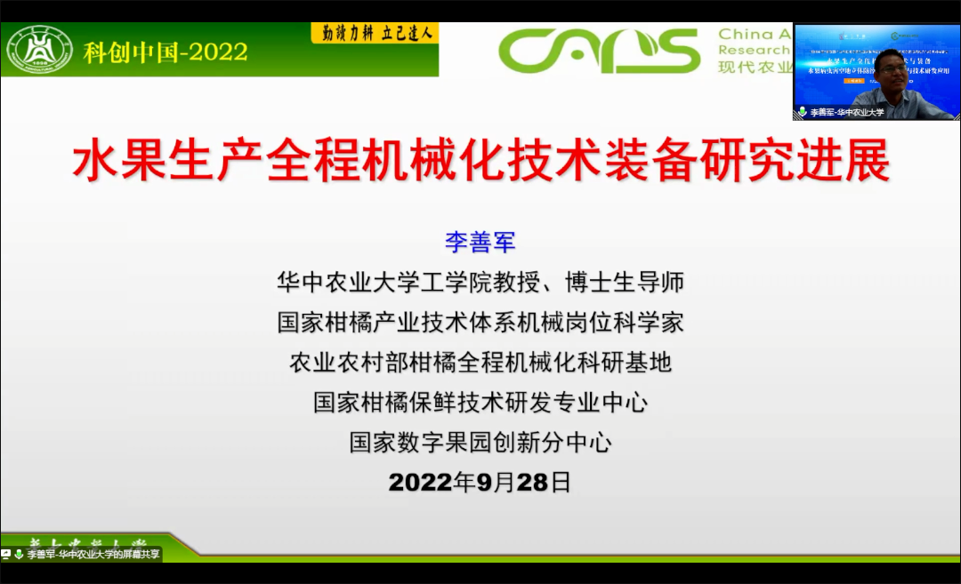 9月28日,中国农业工程学会以线上直播方式开展了“科创中国”葡萄酒产业科技服务团与热带特色高效农业产业科技服务团成果推介与技术对接活动。此次活动邀请了华中农业大学工学院副院长、国家柑橘产业技术体系岗位科学家李善军教授和中国农业大学无人机系统研究院院长、国家梨产业技术体系岗位科学家何雄奎教授作特邀报告。活动由中国农业工程执行秘书长王应宽研究员主持。