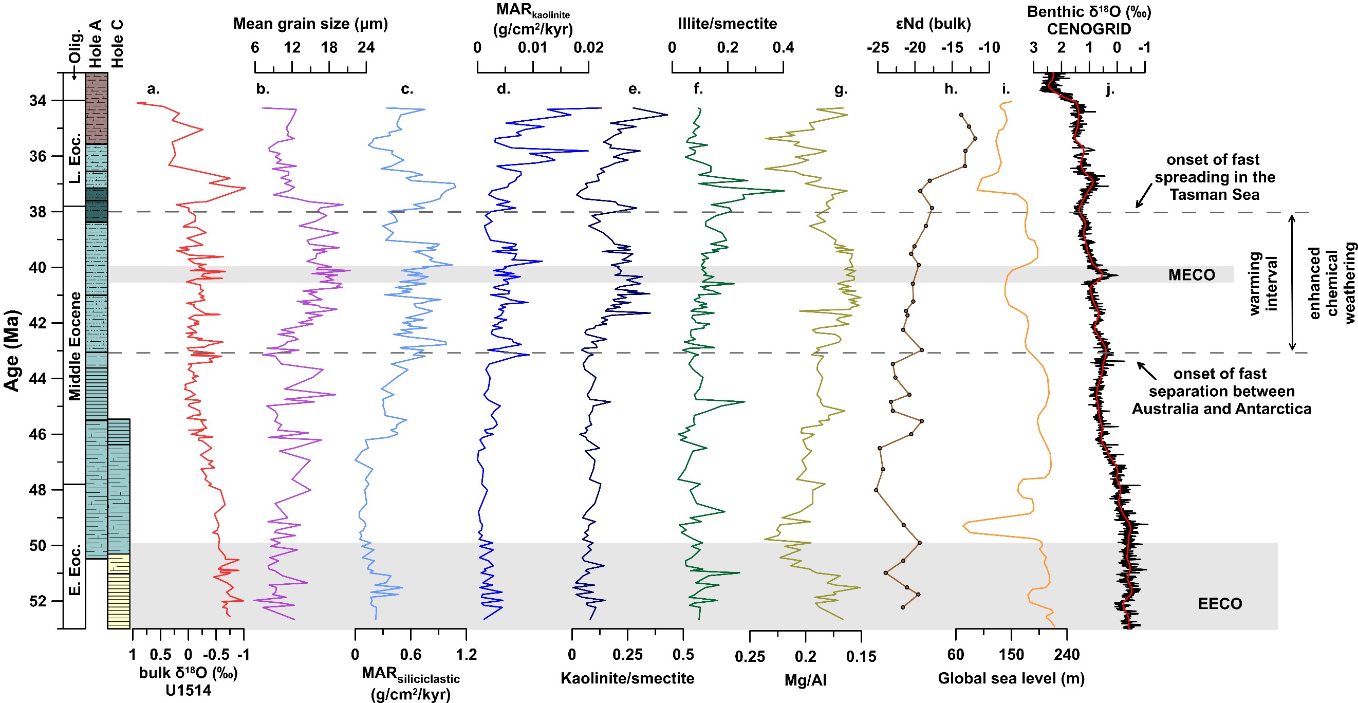 研究人员利用U1514站位岩芯沉积物,基于极好的古生物地层、磁性地层以及全样碳酸盐的碳-氧同位素年代约束,通过沉积学、粘土矿物学、元素地球化学以及同位素地球化学方法,详细地揭示了始新世期间中-高纬度地区(~50-60oS)沉积物源-汇过程的演化历史及其对构造活动和气候变化的响应。物源分析结果表明,始新世期间曼达岬海盆的沉积物来源发生过两次重大改变(图2):早-中始新世阶段(52~43 Ma),该盆地的碎屑沉积物主要来自于澳大利亚西南大陆的中元古代地块(如阿尔巴尼亚-弗雷泽造山带);中始新世后期(43~38 Ma),火山物质与上述陆源碎屑物质均可进入到研究区;晚始新世阶段(38~34 Ma),U1514站位的碎屑沉积物源区则由澳大利亚西南部的远源地块(如伊尔岗克拉通和阿尔巴尼亚-弗雷泽造山带)转变为近源地块(珀斯盆地和露纹杂岩)(图1)。