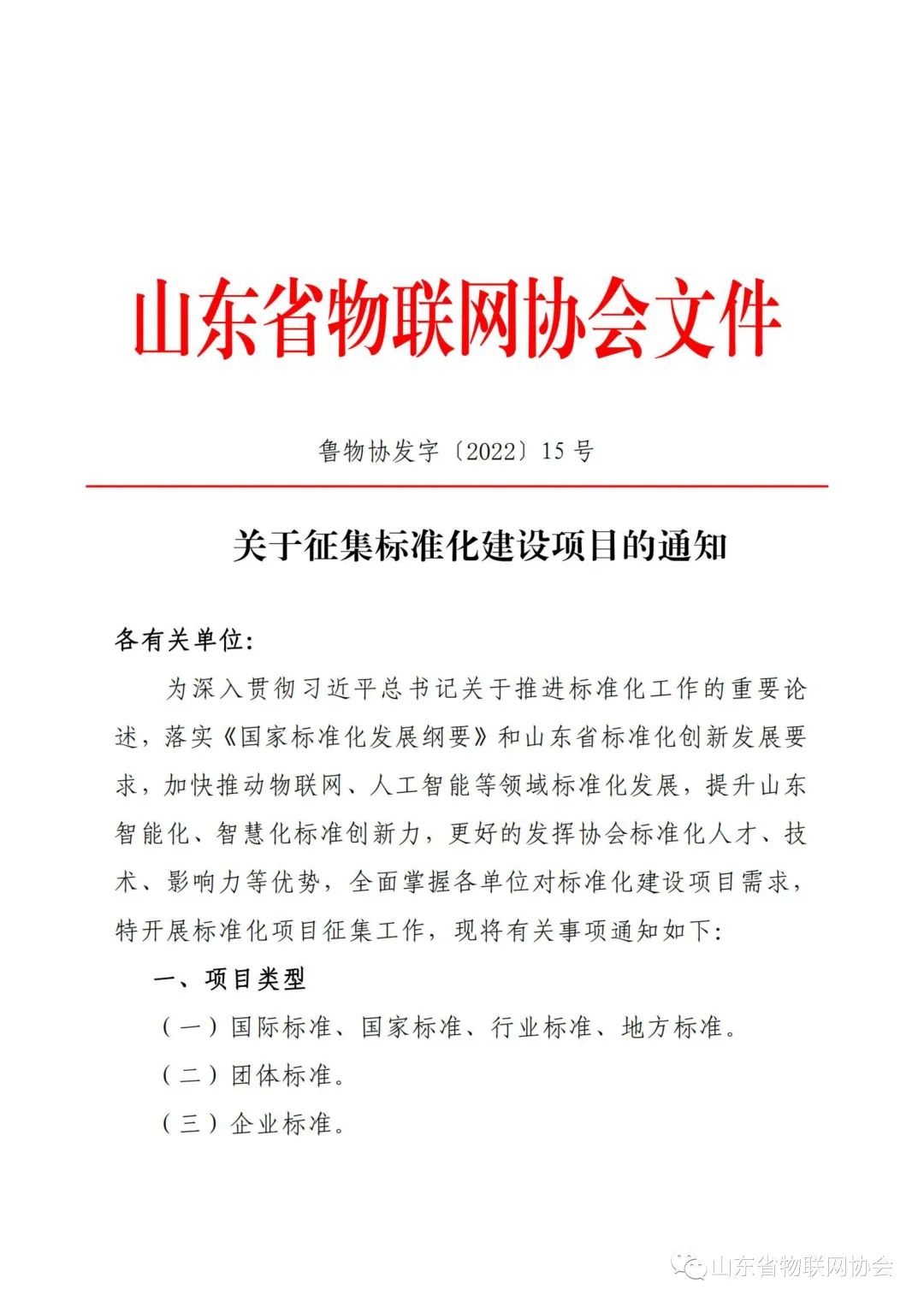 为深入贯彻习近平总书记关于推进标准化工作的重要论述,落实《国家标准化发展纲要》和山东省标准化创新发展要求,加快推动物联网、人工智能等领域标准化发展,提升山东智能化、智慧化标准创新力,更好的发挥协会标准化人才、技术、影响力等优势,全面掌握各单位对标准化建设项目需求,特开展标准化项目征集工作,现将有关事项通知如下:
