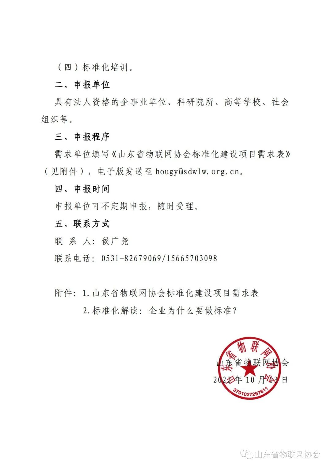 需求单位填写《山东省物联网协会标准化建设项目需求表》(见附件),电子版发送至hougy@sdwlw.org.cn。