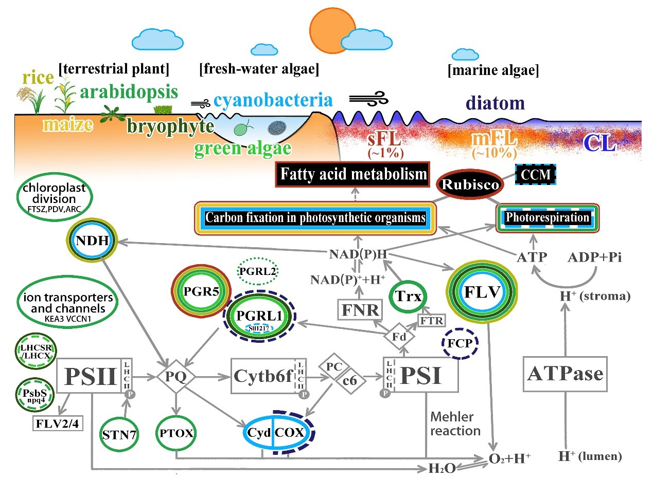 该团队发现相比于甲藻,海洋硅藻可以稳定高效地利用动态光。海洋硅藻光合膜上的质子梯度蛋白(PGRL1和PGR5)对波动光的波动幅度极其敏感性(这一特征明显不同于陆地植物和淡水藻类),在硅藻适应动态光环境过程中起重要调节作用。其中PGRL1过度积累会抑制动态光下的光系统II的效率, 这一重要发现改变PGRL1 仅围绕光系统 I起高光保护作用的认知。研究还发现,海洋硅藻在高强度动态光下,碳固定能力增强和脂质积累升高。以上研究结果不仅有助于我们全面认识海洋硅藻的生物学特性,还为经济海藻的高光效育种和油脂产量的提高提供新思路。