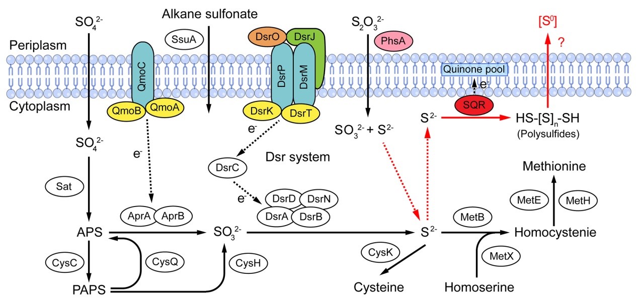 单质硫是硫地球生物化学循环中的重要中间体。在前期科考调查中,海洋所张鑫研究组基于拉曼光谱观测到我国南海冷泉环境中单质硫含量丰富,但是形成原因不清晰。孙超岷课题组在前期工作中从实验室(ISME J, 2020)和深海原位(mBio, 2022)两个层次证实了一株冷泉硫氧化菌能基于一条新型硫氧化途径将硫代硫酸钠转化成单质硫。综合其他科研人员的研究成果,硫氧化菌被认为是单质硫形成的重要贡献者。然而,深海硫酸盐还原菌是否介导单质硫形成及贡献有多大却鲜有报道。借助“科学号”科考船2018年南海冷泉航次获得的样品,孙超岷课题组分离培养了一株典型硫酸盐还原菌Oceanidesulfovibrio marinus CS1。结合拉曼光谱及扫描电镜结果证实该硫酸盐还原菌能通过代谢硫代硫酸钠形成单质硫;结合蛋白组学及蛋白体外表达和功能分析等手段证实硫代硫酸盐还原酶 (PhsA)及硫化:醌氧化还原酶(SQR)在驱动单质硫形成过程中起到关键作用。在这个过程中,硫代硫酸盐先被PhsA还原生成硫化物,然后硫化物被SQR氧化生成单质硫。借助“科学号”科考船2020年南海冷泉航次,科研人员将该硫酸盐还原菌布放在深海冷泉喷口附近并培养了10天,通过蛋白组学实验证实PhsA和SQR的表达显著上调,提示该菌株极有可能在深海冷泉环境中也形成单质硫。值得注意的是,通过宏基因组分析,研究人员发现在南海冷泉不同深度沉积物中的硫酸盐还原菌基因组中phsA和sqr的同源基因广泛存在。考虑到硫酸盐还原菌是深海冷泉环境的一类高丰度微生物,因此,研究人员认为硫酸盐还原菌是介导深海冷泉环境单质硫形成的重要类群。前期大部分研究主要考虑了硫氧化菌对单质硫形成的贡献,而忽略了硫酸盐还原菌在单质硫形成过程中的作用,后期研究需要综合评估其在单质硫形成中的贡献,并揭示相应分子机制及其对深海硫元素循环的驱动作用。