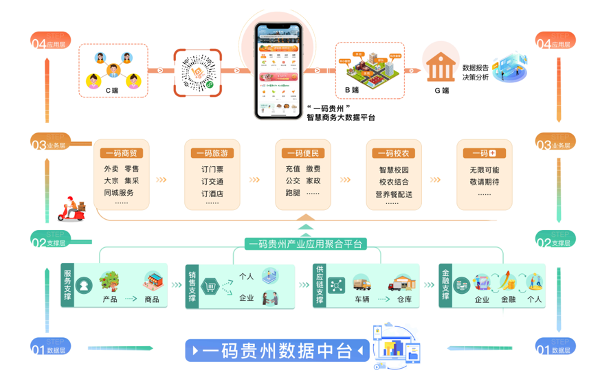 “一码贵州”是由贵州省委宣传部、贵州省商务厅、贵州省大数据发展管理局指导,贵州电子商务云运营有限责任公司负责建设运营,平台涉及“信息消费+乡村振兴”方向,为贵州各类市场主体提供销售、农村电商、智慧仓配、供应链金融、数据监测与分析等综合性电商服务。