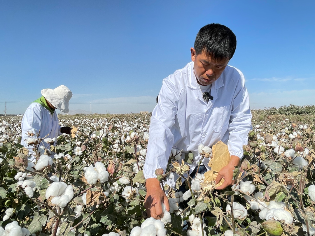 目前,420亩棉花已进入成熟期,孔宪辉与三师农业科学研究所工作人员正在采摘取样。“采摘结束后,我们会将皮棉样本送去新疆农垦科学院的纤维检验室,检测棉花品质,以挑选出适合本地环境生长的最优质的棉花。”孔宪辉说。