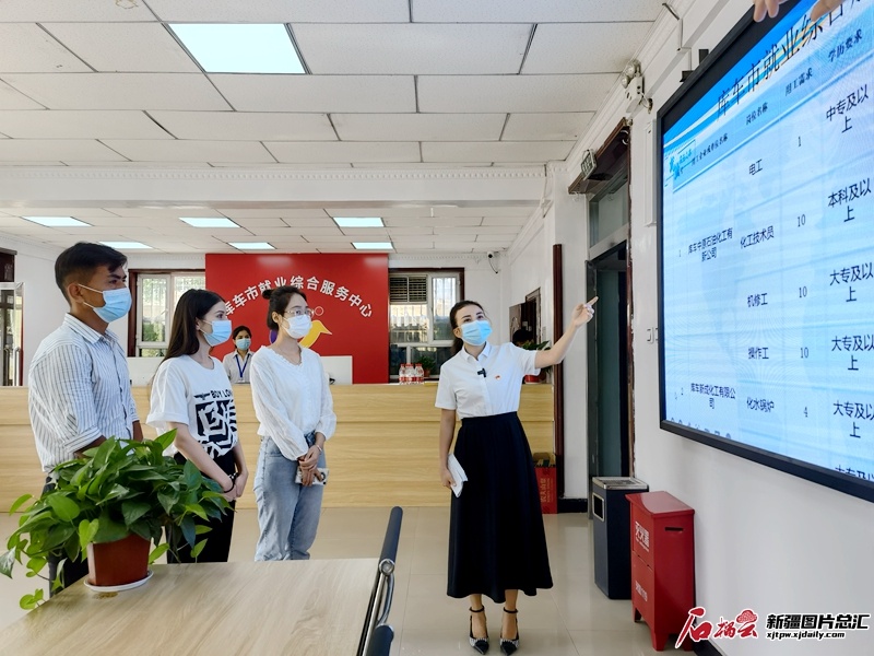 在新疆阿克苏地区库车市就业综合服务中心,工作人员通过大屏幕向求职者介绍就业信息。(摄影:赵霞)