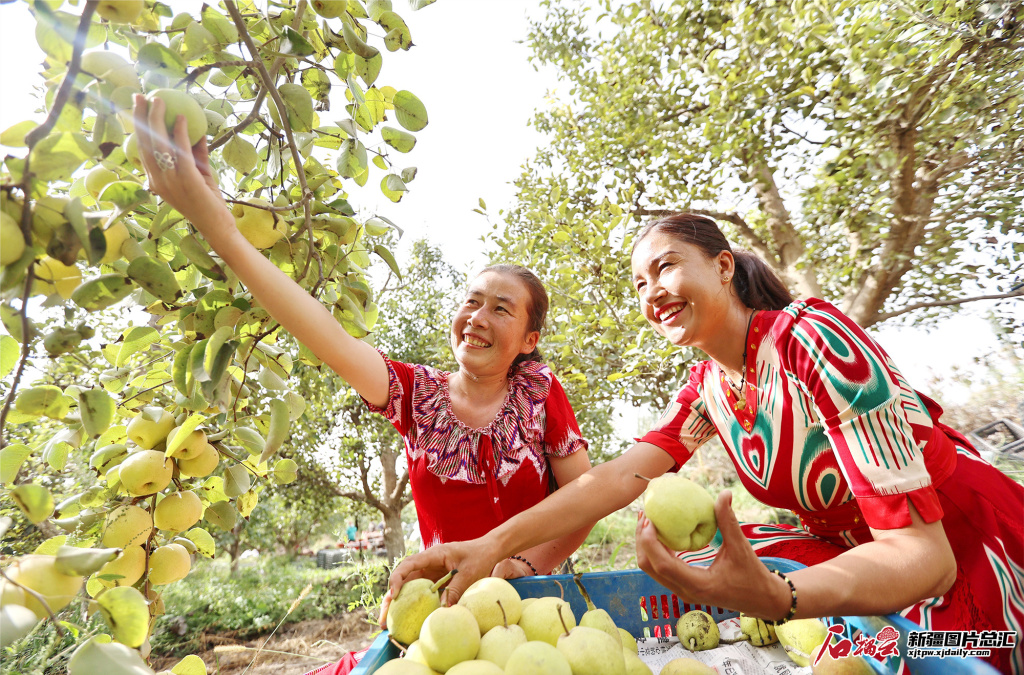 新疆维吾尔自治区阿克苏地区库车市玉奇吾斯塘乡柳树村村民在采摘贡梨。(摄影:吴乐)