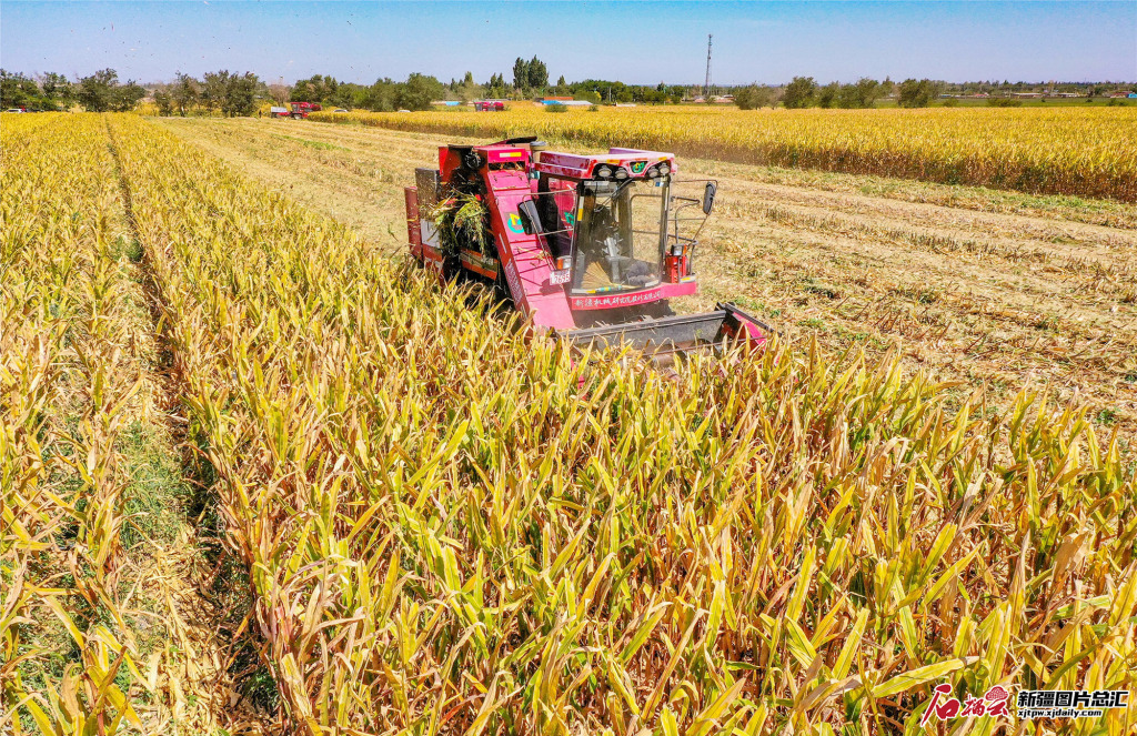 新疆维吾尔自治区昌吉回族自治州呼图壁县五工台镇十九户村,农民正在利用机械采收制种玉米。(摄影:陶维明)