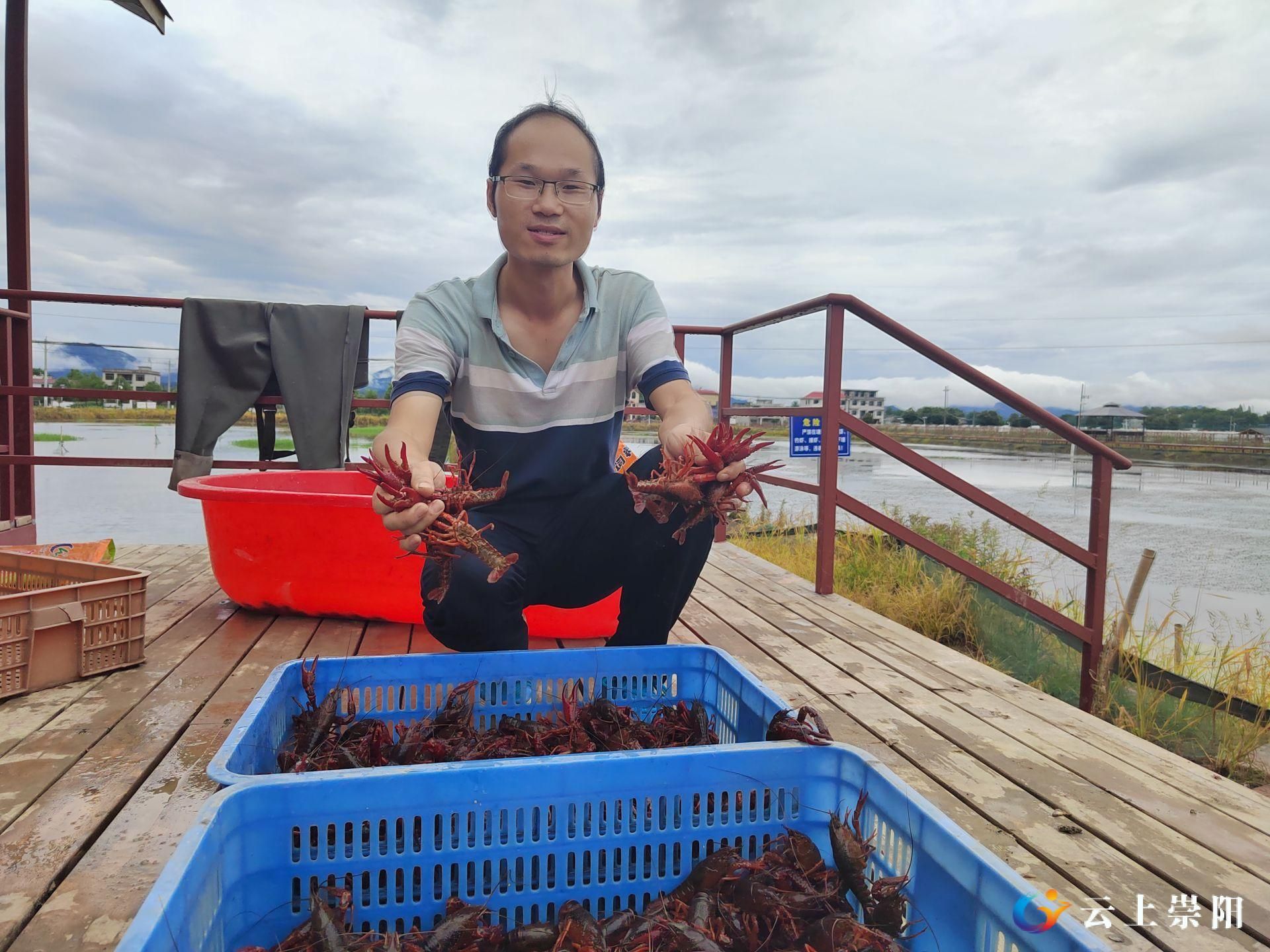 取得华中农业大学渔业硕士学位的金星村村民沈勇亮回乡创业,本已在咸宁市咸安区向阳湖镇投资150万元,建有500余亩的小龙虾生态立体种养殖基地的沈勇亮,在崇阳县人才引进政策的吸引下,在各相关部门的大力支持下,沈勇亮投资100万元创建了金星村现代农业产业园小龙虾产业化科研示范基地,进行小龙虾养殖。依托金星村良好的水源和便利的交通条件,基地养殖出来的小龙虾全程没有使用水产药品,小龙虾绿色健康,个头也比较大,一上市就供不应求。