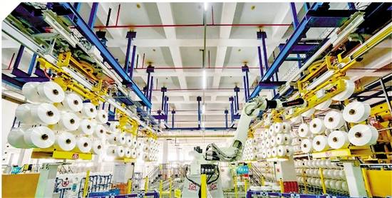 地处桐乡的桐昆集团聚酯纤维未来工厂,工人再不用为重物搬运烦恼:一个个丝饼从产线自动落到运输车上,沿轨道被送至包装车间,再经智能打包、张贴标签后,随传输车进入立体仓库。目前,这一厂区自动化率达90%以上,万元产值成本下降63%。