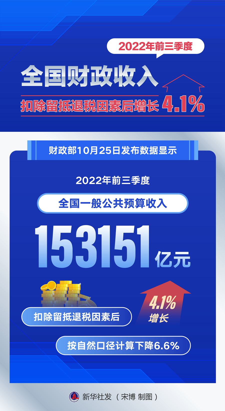 财政部25日发布数据显示,今年前三季度,全国一般公共预算收入153151亿元,扣除留抵退税因素后增长4.1%,按自然口径计算下降6.6%。