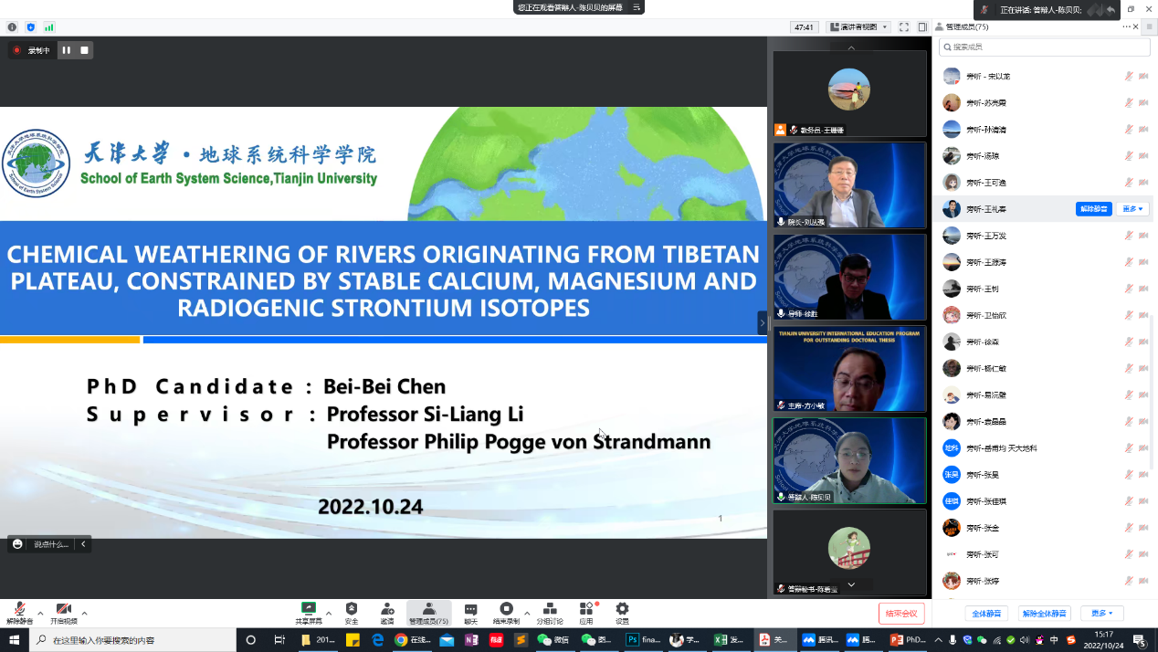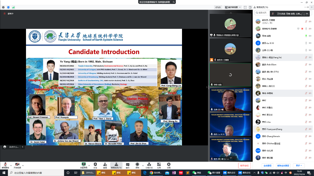 (通讯员 王珊珊)2022年10月24日,天津大学地球系统科学学院(以下简称“地科院”)在线举办首届博士学位论文答辩国际评审会(以下简称“国际评审会”)。博士生陈贝贝和杨业以全票通过的成绩顺利完成博士学位论文国际答辩。本次国际评审会主席由中国科学院青藏高原研究所方小敏研究员担任,委员包括英国格拉斯哥大学Rob Ellam教授、新加坡国立大学Xixi Lǚ教授、丹麦技术大学Xiaolin Hou教授和中国科学院地理科学与资源研究所郭庆军研究员等环境及地理科学领域的国内外知名专家学者。地科院院长刘丛强院士、学生导师及70余位师生在线参会。