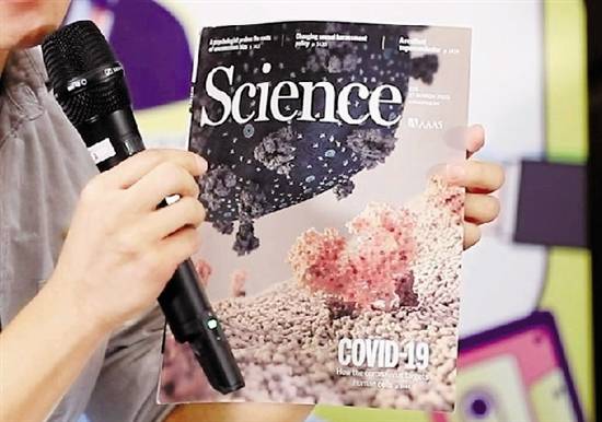 随后,他把从盲盒里取出的国际顶级期刊《科学》高高举起。这期《科学》的封面论文,就是其同事周强的团队关于新冠病毒的研究成果。