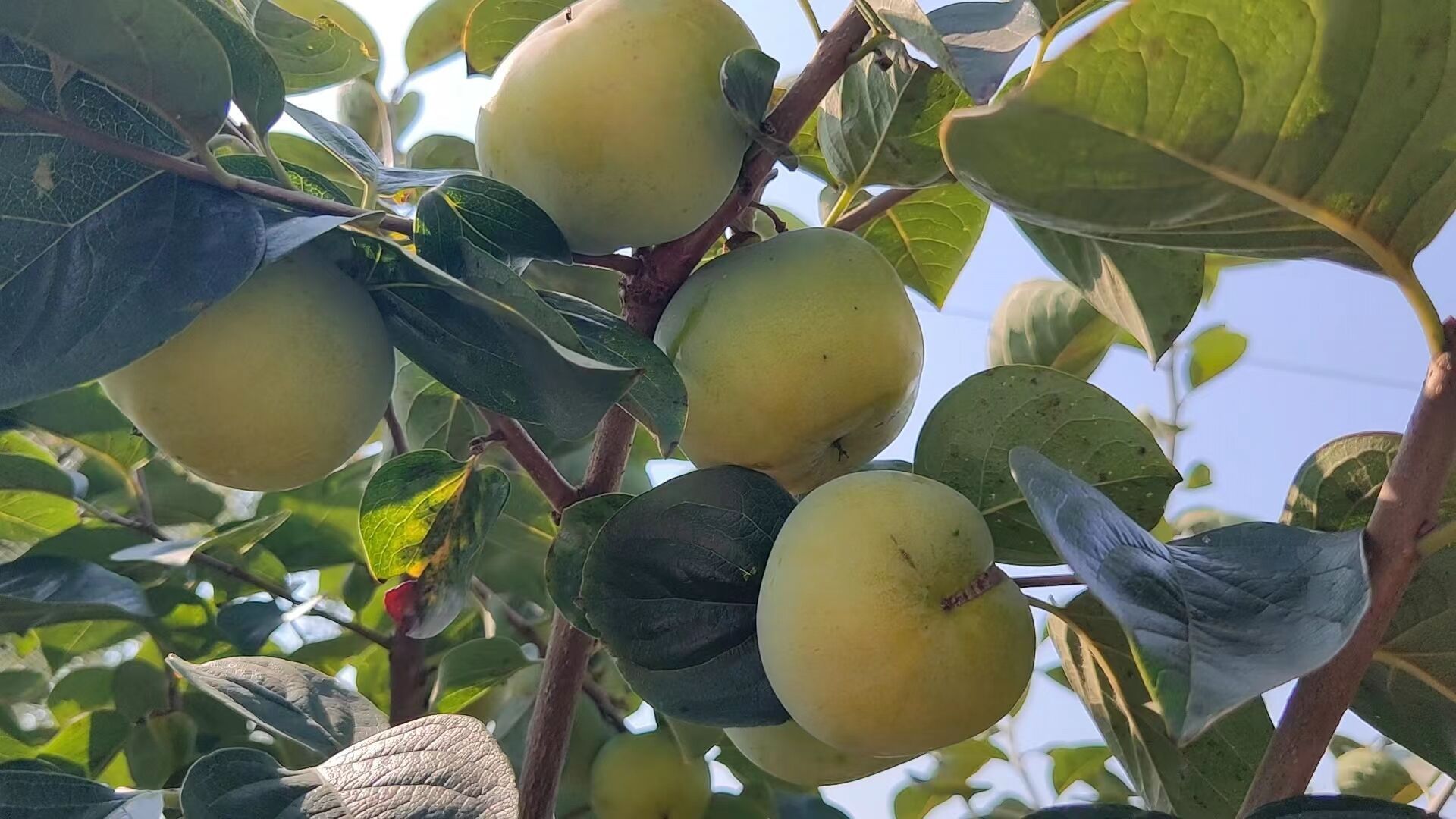 该果园不仅有按颗售卖的葡萄,还有绿中带黄就可食用的太秋甜柿。在露天种植的十亩二年柿苗地上,部分柿苗已经结出稀疏的果实,柿子被布袋捆扎好,防止被鸟类啄食,数名农户穿梭在田块之中为树苗浇水或除草。另外二亩地的四年生太秋甜柿树被防鸟网整个覆盖,两米多高的柿子树上,挂满了拳头般大小的果实,微风吹过,阵阵果香扑鼻而来。