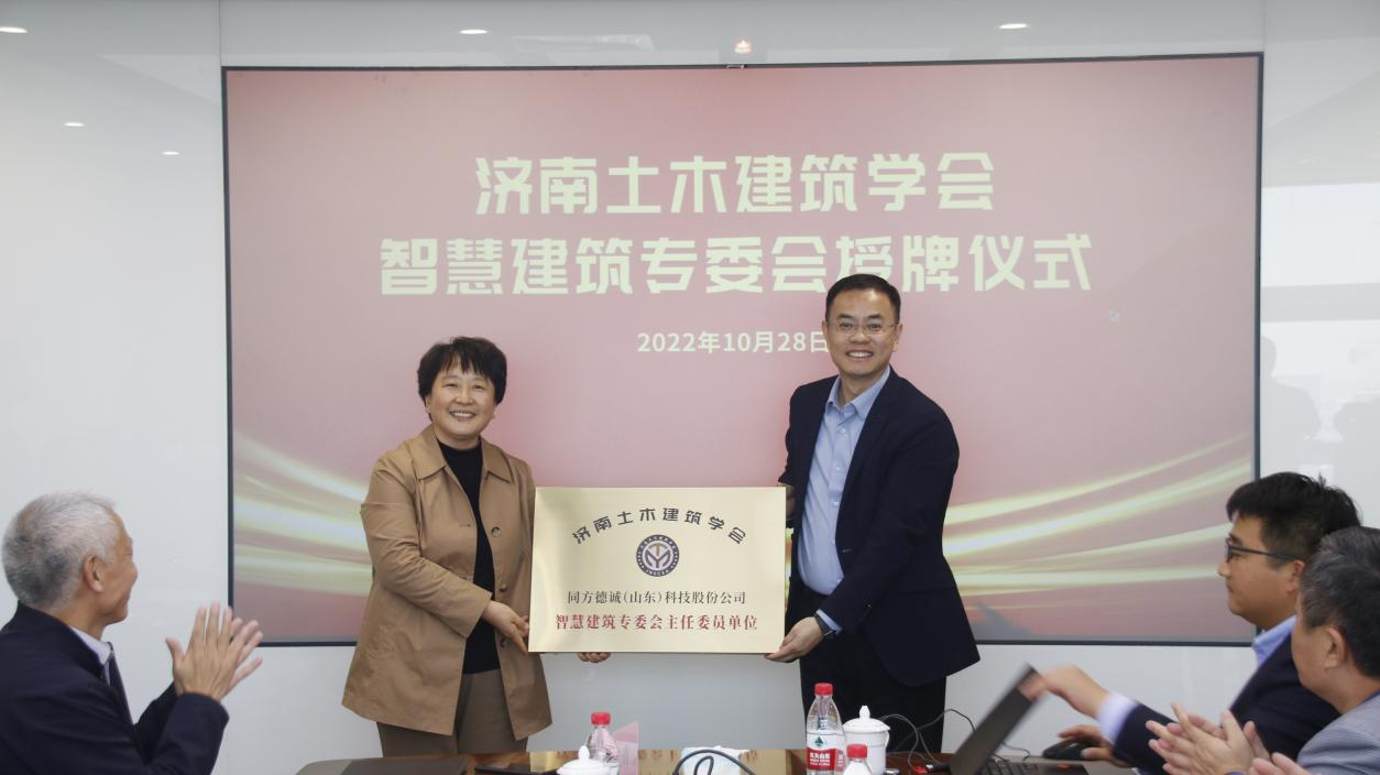 2022年10月28日下午,济南土木建筑学会智慧建筑专业委员会授牌仪式于同方德诚(山东)科技股份公司举行。市住建局发展处副处长寇雪军、济南土木建筑学会理事长万成梅,同方德诚(山东)科技有限公司董事长兼总经理翟兆国、山东建筑大学教授张桂青及有关领导、专家出席了会议。会议由济南土木建筑学会秘书长王军主持。