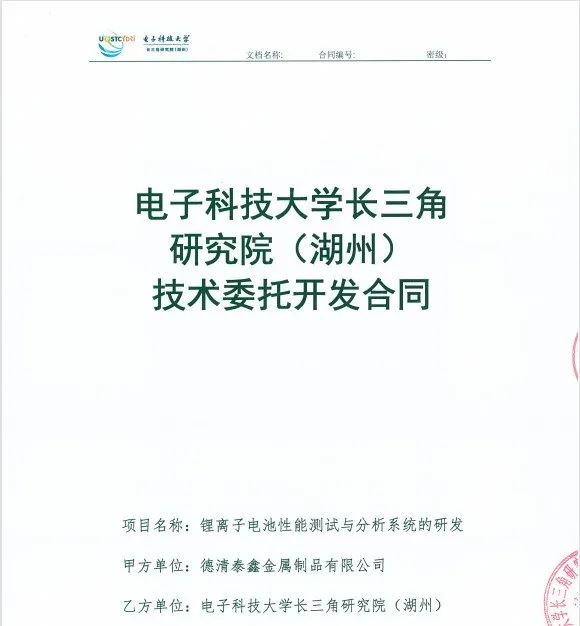 2022年6月13日,在市、县科技局的共同努力下,电子科技大学长三角研究院(湖州)与泰鑫正式签订技术委托开发合同。双方在此次合作中,将通过实验对锂离子电池进行充放电测试,采集充放电循环的电流、电压、容量等信息;并采用基于Stacking集成学习的方法以及结合高精度的深度学习基础模型,开发出适用于退役锂离子电池梯次利用高泛化性、高准确性的检测与分析系统,包括电池内阻、荷电状态、健康状态、剩余使用寿命、一致性评估等功能。经过该系统的人工智能训练和分析,最终可获得相关参数性能,且能够在行业内居于领先水平。
