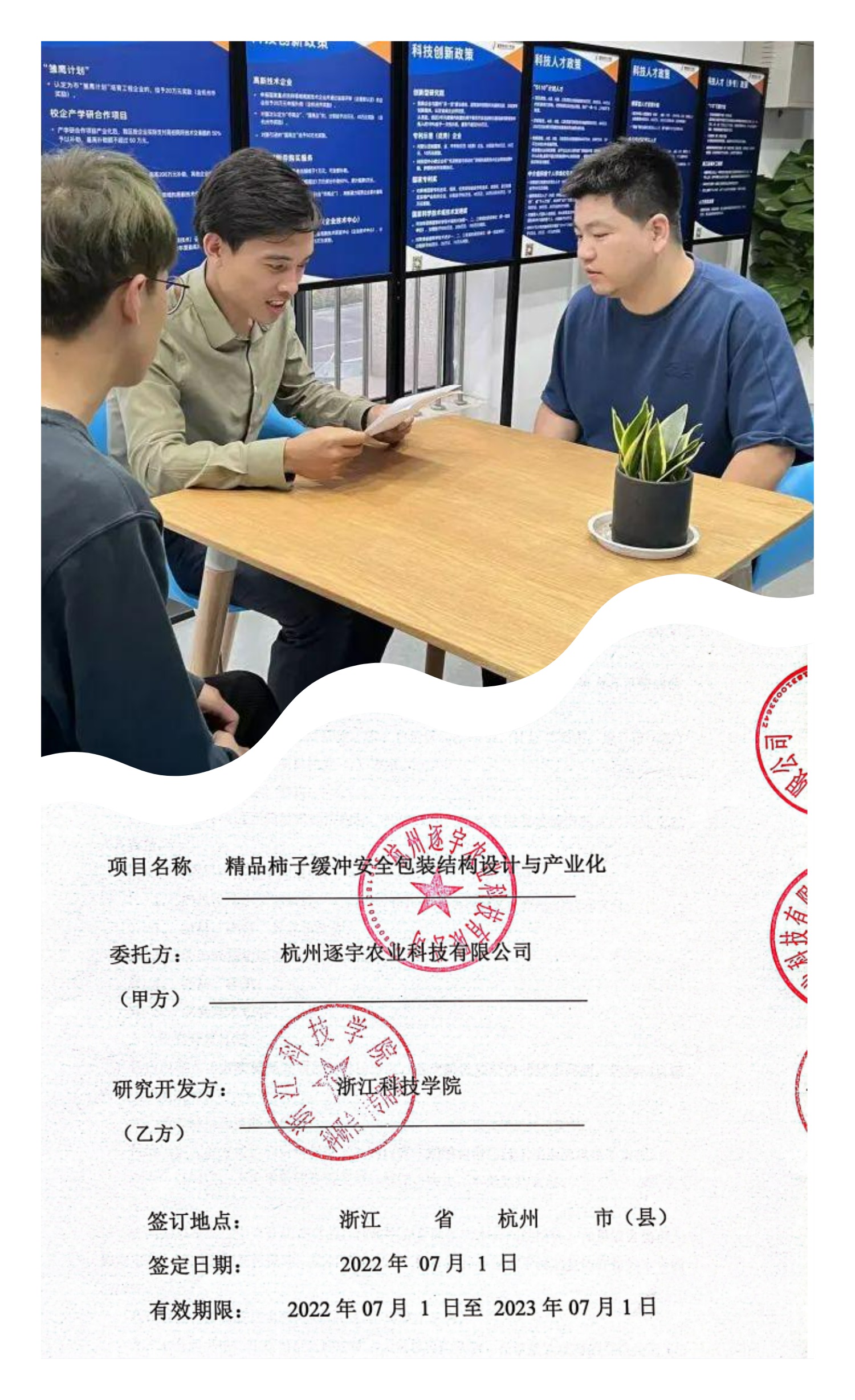 在陈老师团队的指导服务下,逐宇农业于今年注册商标“吾亩良品”;并于2022年7月1日校企双方就“精品柿子缓冲安全包装结构设计与产业化”签署产学研合作协议。