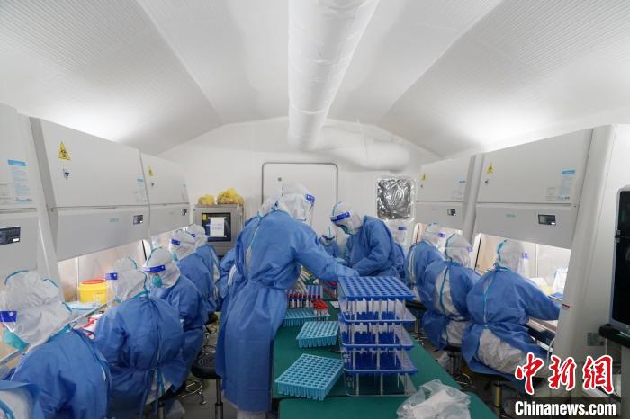 图为身着防护服的工作人员在胶囊气膜实验室内忙碌。 马铭言 摄