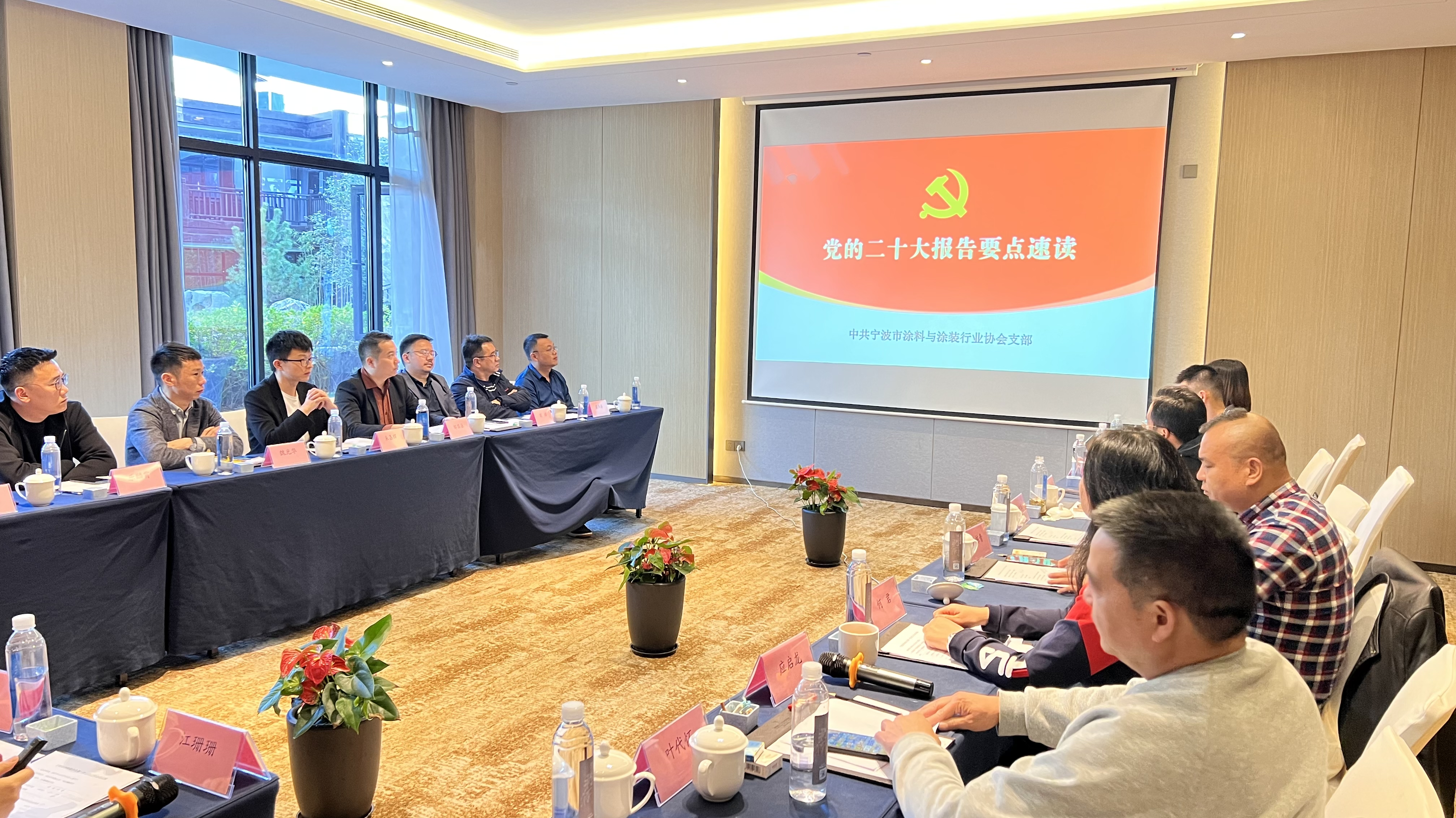 在自由交流环节,新老会员对各自的企业及业务现状、需求点做了简介,大家谈笑共鸣不断,相互邀约会后的进一步相互走访。接着由江珊珊分会秘书长带领参会人员进行了党的二十大报告专题学习。