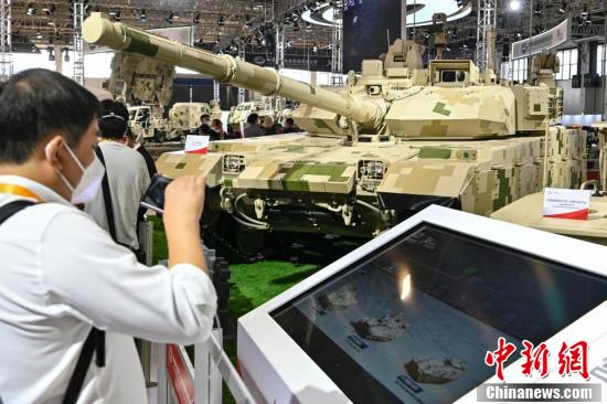 11月9日,广东省珠海市,观众在第十四届中国航展上参观陆军合成旅实战体系中的坦克营装备。陆军合成旅解决方案涵盖作战支援营、侦察营、坦克营、机步营、炮兵营、反坦克营、防空营、无人机营等。