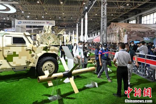 11月9日,广东省珠海市,观众在第十四届中国航展上参观陆军合成旅实战体系中的反坦克营装备。陆军合成旅解决方案涵盖作战支援营、侦察营、坦克营、机步营、炮兵营、反坦克营、防空营、无人机营等。
