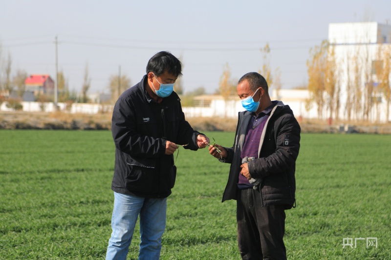 博湖县塔温觉肯乡农业技术人员与种植户查看小麦长势情况(央广网发 胡侍琦 摄)
