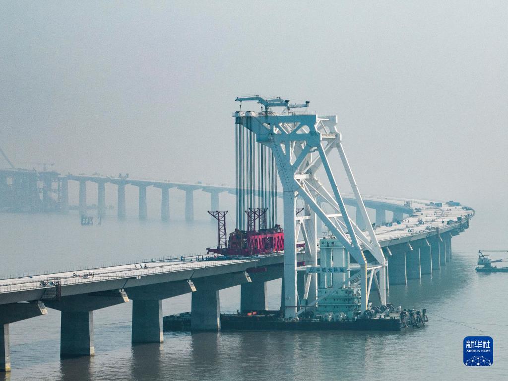 11月10日,深中通道海上非通航孔桥即将架设最后一片混凝土箱梁(无人机照片)。新华社发(陈正东摄)