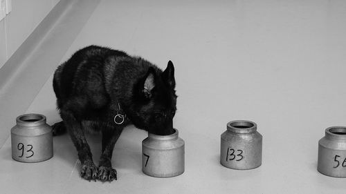 《中国科学报》记者在一次犬嗅辨现场看到,科研助手将装有数个标本的罐子放在实验室内,其中一个标本A是临床确诊的帕金森病患者的标本。放置完毕后,全程未参与整个准备过程的训犬员将嗅辨犬带进实验室,让其从多个罐子中嗅辨帕金森病患者的样本。犬能迅速定位放置患者样本的鉴别罐。