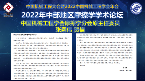 摩擦学分会原主任委员、中部摩擦学学术论坛倡导人张嗣伟教授致贺信,贺信中为摩擦学下一步发展提出了思路,并祝论坛圆满成功。
