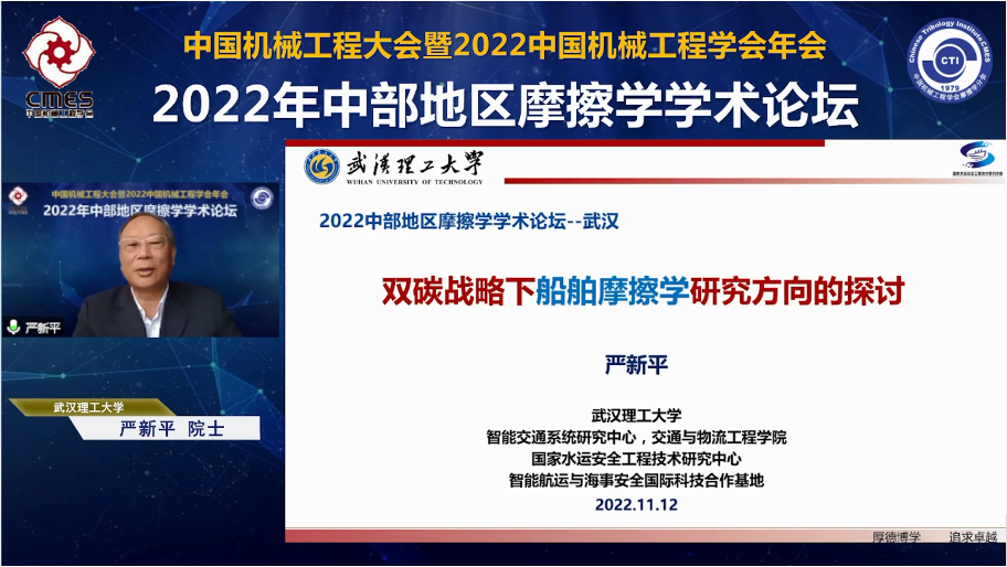 中国工程院院士、武汉理工大学严新平教授作了题为“双碳战略下船舶摩擦学研究方向的探讨”的大会特邀报告。