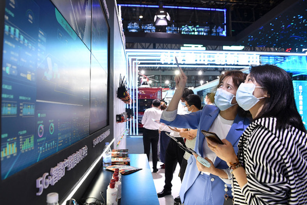在2021智博会现场,工作人员(前左)向观众介绍“5G+智能制造”的应用。(资料照片)新华社记者 唐奕 摄