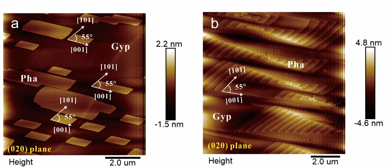针对以上问题,天津大学地球系统科学学院界面和土壤圈演化中心滕辉教授团队利用原子力显微镜AFM从分子尺度精细研究了典型钙砷酸盐矿物毒石(CaHAsO4·2H2O)在石膏 (010)面的结晶生长过程,通过测量临界台阶长度和台阶移动速率,得到了毒石4个不同结晶方向的台阶能量和5个不同结晶方向的台阶移动速率动力学系数,并进一步利用台阶移动速率和过饱和度的关系推导出了毒石的溶度积,得到主要结论如下: