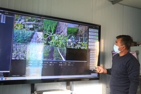 物联网大数据平台给温室大棚“装上了大脑”。在显示屏上,实时显示着大棚的监控画面和温度、湿度、种植品种等信息。“我们采用的是可视农业物联网操作系统对大棚蔬菜管理,手机上也可以异地操作,根据大棚温度、湿度实现自动放风远程控制,日常管理很方便。同时利用温室水肥一体机,可以完成所有大棚的浇水、施肥,省工、省时,既节约人工成本,也有利于农作物的生长。”李勇介绍说。