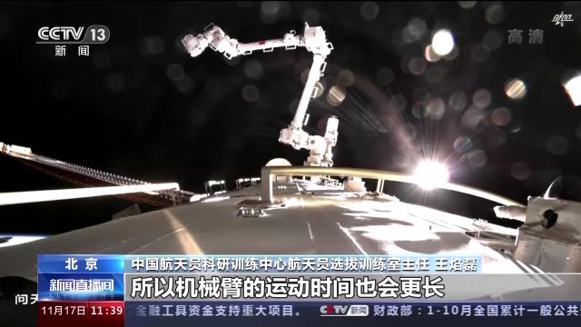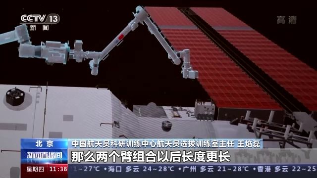 中国航天员科研训练中心航天员选拔训练室主任 王焰磊:我们首次使用两个机械臂,就是大臂小臂形成组合臂的状态下支持出舱活动任务。因为大家可以想象一下,单臂的长度已经很长了,那么两个臂组合以后长度更长,它的柔性、刚性等和我们单臂状态下是有一些区别的。在这种情况下载人去支持完成出舱任务,也是我们做首次的一个验证。