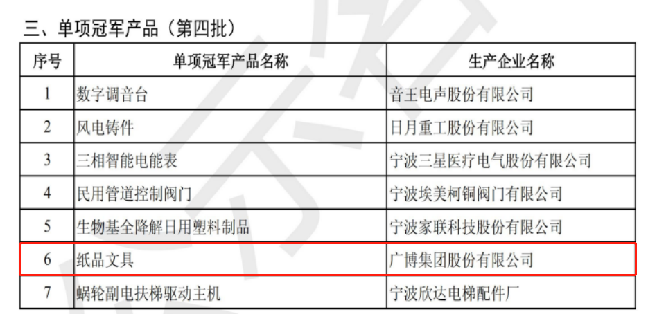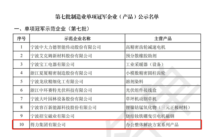 其中,宁波文具行业协会副理事长单位得力集团有限公司(办公整体解决方案系列产品)入围第七批制造业单项冠军企业培育遴选名单、广博集团股份有限公司的纸品文具产品通过第四批制造业单项冠军产品复核。