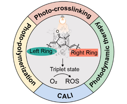 上述成果以“Enabling Photo-Crosslinking and Photo-Sensitizing Properties for Synthetic Fluorescent Protein Chromophores”为题,于近日发表在《德国应用化学》(Angew. Chem. Int. Ed.)上。该工作的第一作者是我所02T5组博士研究生冯焕和1810组赵群研究员。该工作得到了国家自然科学基金、国家重点研发计划、中科院青促会、美国国家科学基金等项目的资助。(文/图 冯焕、赵群)