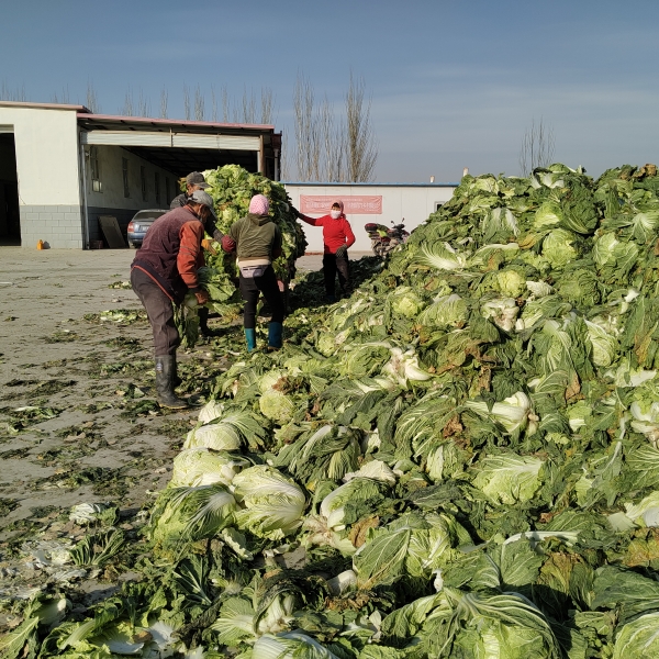 11月16日,博湖县塔温觉肯乡科克莫敦村村民常江和务工人员正忙着清理大白菜外层多余的菜叶,将一颗颗紧实的大白菜装车拉运到蔬菜气调库进行保鲜储藏,为冬季供应做好准备。