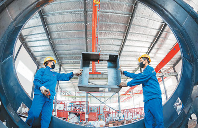 在江苏省海安市白甸镇一企业车间内,工人们正在赶制建材装备订单。翟慧勇摄(人民视觉)