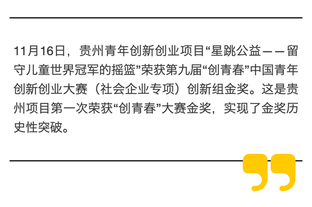11月14日至16日,由共青团中央、人力资源和社会保障部、农业农村部、商务部、国家乡村振兴局、辽宁省人民政府主办的2022年中国青年创新创业交流营暨第九届“创青春”中国青年创新创业大赛社会企业专项赛在辽宁大连举行。经过激烈角逐,贵州青年创新创业项目“星跳公益——留守儿童世界冠军的摇篮”荣获第九届“创青春”中国青年创新创业大赛(社会企业专项)创新组金奖,这是贵州项目第一次荣获“创青春”大赛金奖,实现了历史性突破。