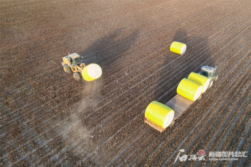 11月3日,在尉犁县兴平镇达西村“超级棉田”内,车辆正在拉运新棉。汪志鹏 摄