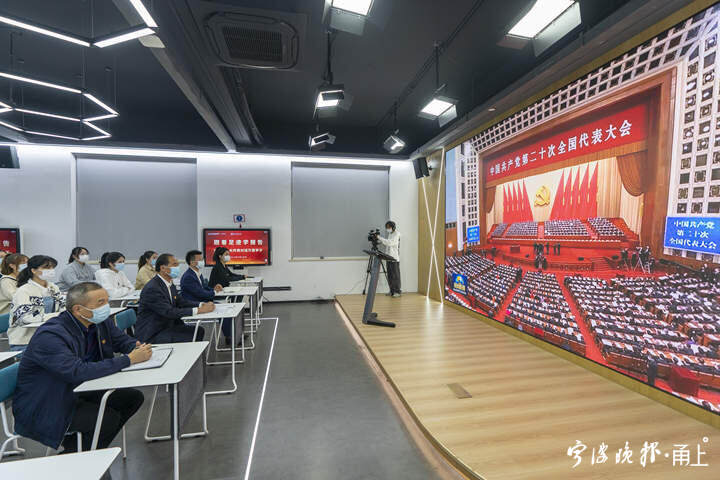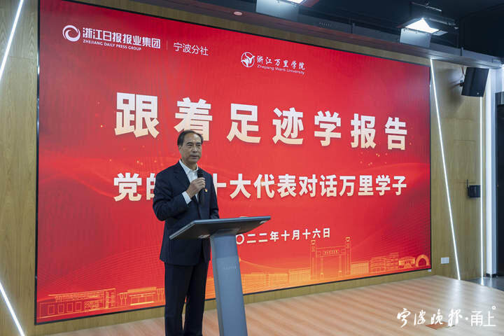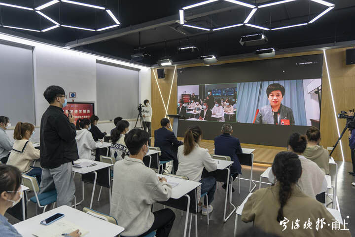 10月16日晚,浙江万里学院内,党的二十大代表、宁波市北仑区大碶街道灵峰社区党委书记史孟艳连线万里学院学生。