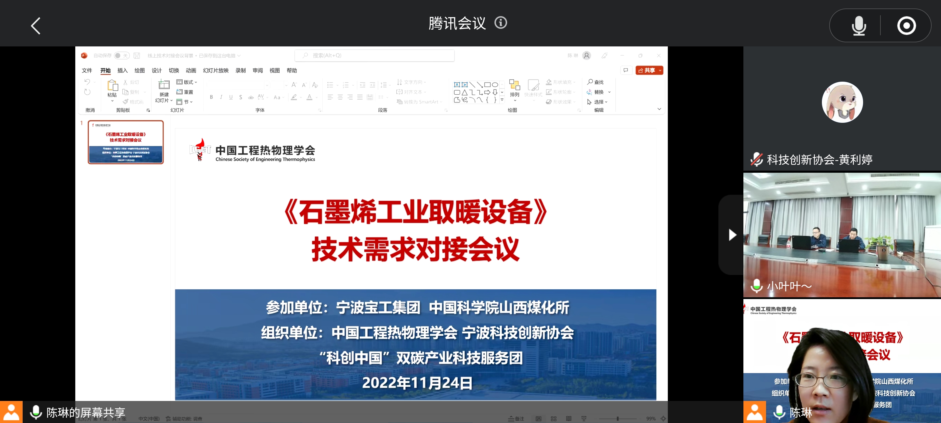 为助企引进引入国家级学会专家资源,解决“卡脖子”技术难题,由中国工程热物理学会、宁波市科技创新协会、“科创中国”双碳产业科技服务团共同组织的“《石墨烯工业取暖设备》技术需求对接会”于2022年11月24日通过网络会议的方式如期举行。